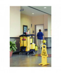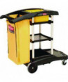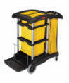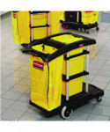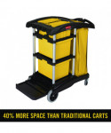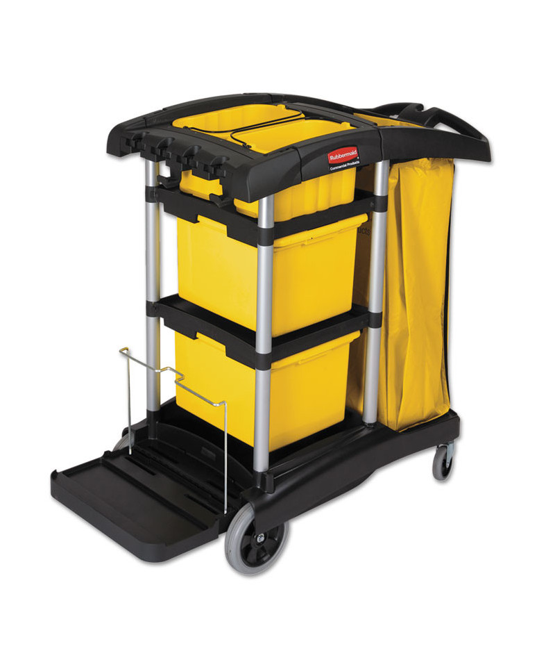 Compact, easy-to-maneuver cart features excellent, efficiency-enhancing tool storage and organization options. Slide-out 30-quart storage bins and lift-out 10-quart disinfecting caddies may be accessed from either side of the cart. Front platform accommodates charging buckets and waste receptacles, but folds out of the way when you prefer to attach various Rubbermaid® Commercial mop buckets to the Lock 'N Go system. Convenient zippered 33-gallon vinyl bag. Ergonomic Comfort Grip handle with integrated dust pan and vacuum holders. Innovative rubber Tool Grips for attaching mop and broom handles. Safety sign hooks. Easy-to-clean aluminum and structural web plastic construction.