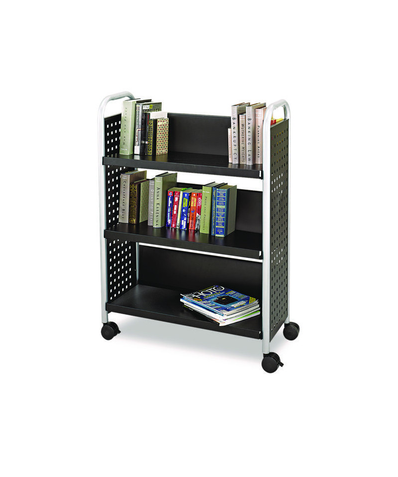 Perfect for use in libraries, schools or any work area with a large collection of books. All-steel construction with unique hole pattern design is accented by tubular steel legs. Oversized casters for easy maneuverability. Black powder coat finish for durability.