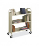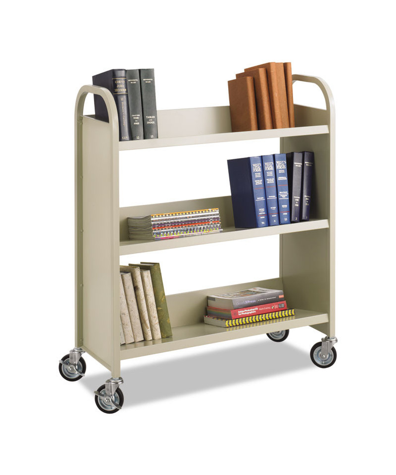 Safco Double-Sided Book Cart holds manuals, binders, folders and files to keep your books organized and mobile. Heavy-duty steel cart features three slanted shelves to hold books in place and oversized swivel wheels for easy rolling. Manufactured with 100% welded steel, the cart includes a powder coat finish to help resist chipping and scratching while the oversized swivel wheels allow for easy movement. This versatile cart is designed for use in an office, collaborative space, library, classroom, home office, church, bookstore or any space that needs organization for essential documents and literature.