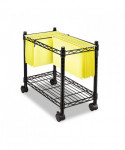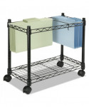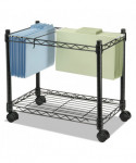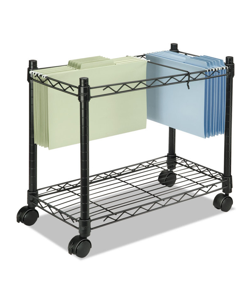 Features adjustable divider system to accommodate both letter and legal size hanging folders at the same time. Multi-purpose bottom shelf provides additional storage. Roll under desk when not in use. Easy, tool-free assembly. Four twin wheel casters (two locking). Organize letter or legal size hanging file folders for deskside access. Rolls under desk or credenza when not in use. Wire and metal tube construction provides strength and durability. Handy bottom shelf for additional storage. Product is 100% recyclable.