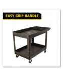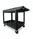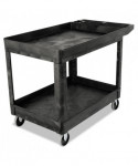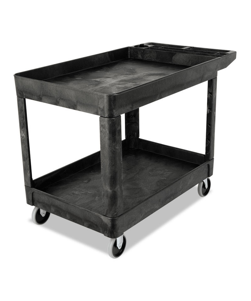 This utility cart is perfect for transporting materials, supplies, and heavy loads in almost any environment. Ergonomically-designed push handle provides optimum hand placement and push height, improving control and worker safety. Molded-in storage compartments, holsters, hooks and notches for ideal storage. The rolling utility cart features molded-in customizable fittings. High-density structural resin construction. Easy-access bottom shelf. Best-in-class casters to meet the most demanding environments.