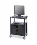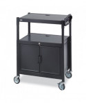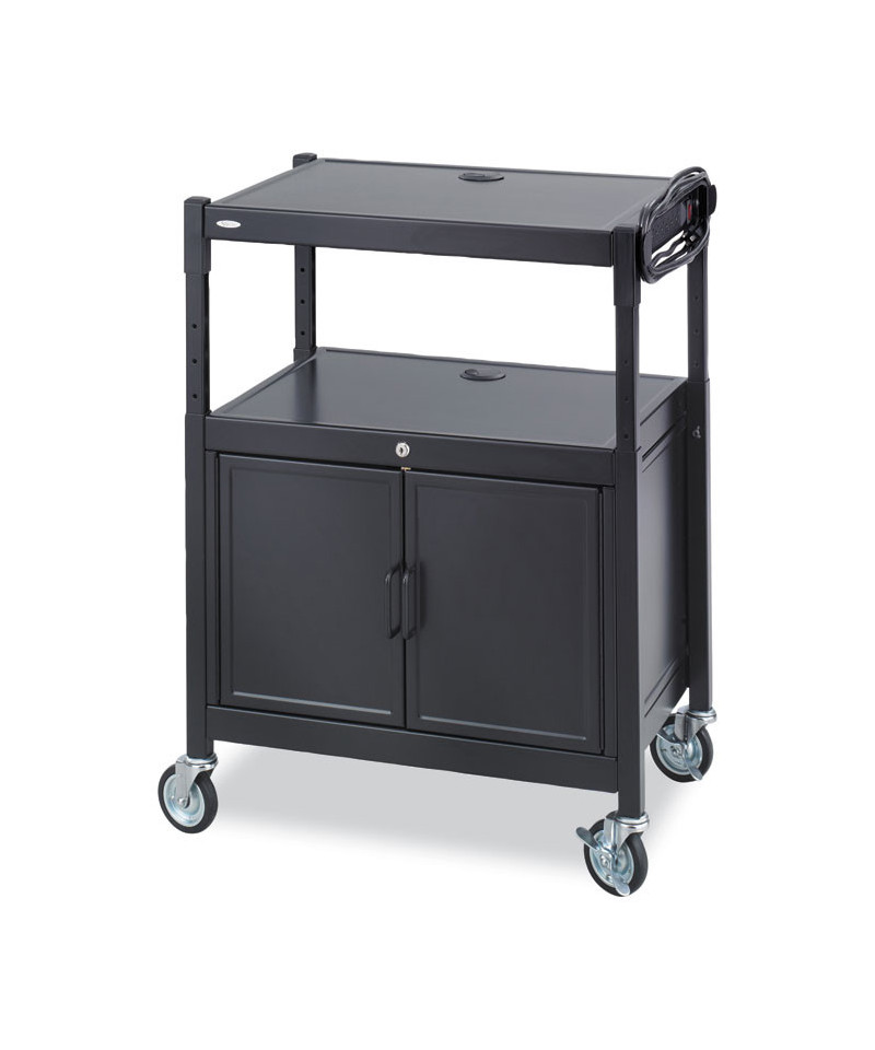 Upgrade your presentation setup with the Steel Adjustable AV Cart with Cabinet, a durable and versatile solution for classrooms, offices and conference rooms. Designed to hold monitors up to 20 inches, this sturdy steel cart offers a height-adjustable design, allowing you to customize the height from 26 to 42 inches in 2-inch increments to meet your viewing and accessibility needs. Equipped with a secure locking cabinet, it provides safe storage for valuable AV equipment, accessories or presentation materials. The built-in six-outlet, UL-approved mini-surge protector ensures convenient power access while protecting your electronics from surges. For effortless mobility, the cart moves smoothly on four durable casters, with two locking wheels to keep it securely in place when needed. Whether used for projectors, laptops, or media devices, this reliable and mobile AV cart delivers functionality, security and convenience, making it a must-have for any professional or educational setting. Enhance your presentations with this all-in-one AV solution today!