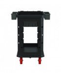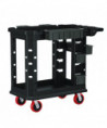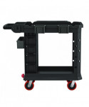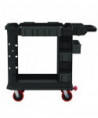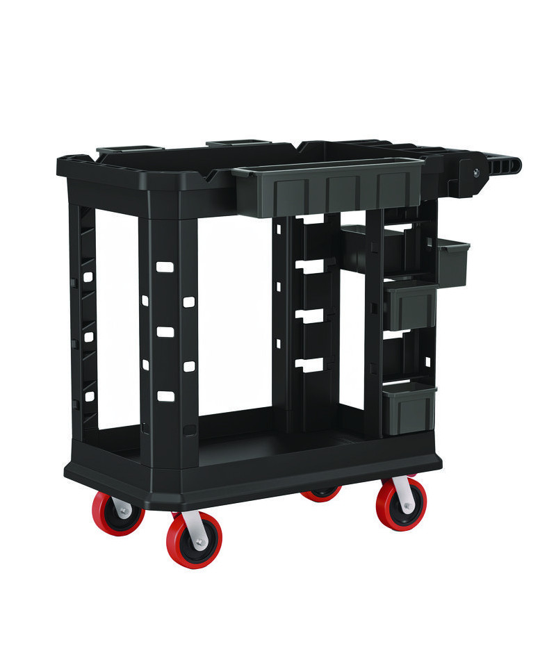 Suncast Commercial® Heavy Duty Plus Utility Cart is designed to be the most versatile cart on the market. This cart is equipped with an innovative caster system that allows for a fixed front caster mode, or a full range 360° swivel movement when desired. This unique feature makes this cart perfect for tight spaces, sharp corners and side-to-side handling. This system is adjusted with an effortless lever accessible with your foot. Equipped with six movable bins, this cart can be customized to your organizational needs.