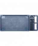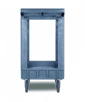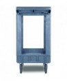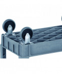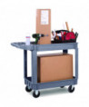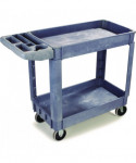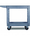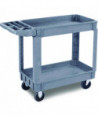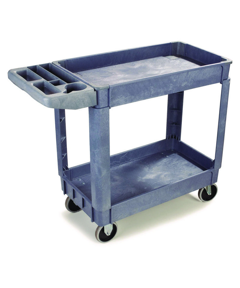 Durable resin construction, gray, two-shelf utility cart with casters. Molded-in plastic handle allows for easy steering on the go. The handle and raised top rim are great for hanging cleaning products and supplies to tackle cleaning jobs from one room to the next. Round and rectangular top compartments keep small items like cords and tools organized. Convenient swivel casters allow multi-directional travel around tight corners. Two fixed shelves provide sturdy storage for all your janitorial supplies.