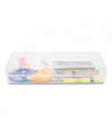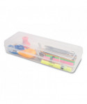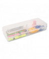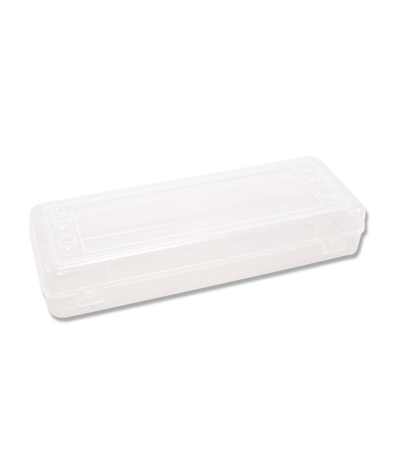 Perfect for storing school or art supplies. Snap-tight lid to keep contents secure. Clear for easy viewing. Durable socket/pin hinges and secure double clasp design. Fits in backpacks for easy carrying. Stretch design allows for storing long items such as rulers and paintbrushes.
