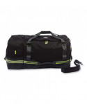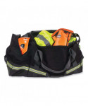 This firefighter turnout bag is designed to organize and haul bulky firefighter gear, work gear, tower climber safety equipment and more. Built tough to withstand harsh conditions, the exterior is made with durable 1,000D polyester and a reinforced water-resistant tarpaulin-reinforced bottom to keep gear dry and protected. The main clamshell compartment is large enough to store firefighter gear and boots, while the zippered side pouch can hold a firefighter helmet, safety hard hat or SCBA mask. A padded shoulder strap and top handle makes it comfortable to transport heavy gear, while multiple handles around the sides allow for quick loading and unloading no matter which way the bag is faced. Reflective accents enhance visibility in low-light conditions. The heavy-duty work duffel bag is i