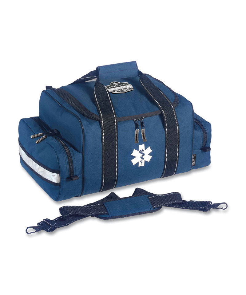 This large first responder bag is built to carry basic life support supplies and oversized specialized medical devices in on-the-go situations where first aid is needed. Built tough to withstand harsh conditions, the exterior is made with 600D polyester for long-lasting use while transporting heavy supplies. This medic trauma duffel bag features a large storage space with collapsible internal dividers that can be used for customized organization or removed to fit larger-sized medical devices. Two zippered side pockets and 19 webbed storage loops offer additional storage for quick access to first aid supplies. A padded shoulder strap and top grab handle make for easy transport in a rapid response situation. Reflective accents enhance visibility in low-light conditions. First aid supplies n