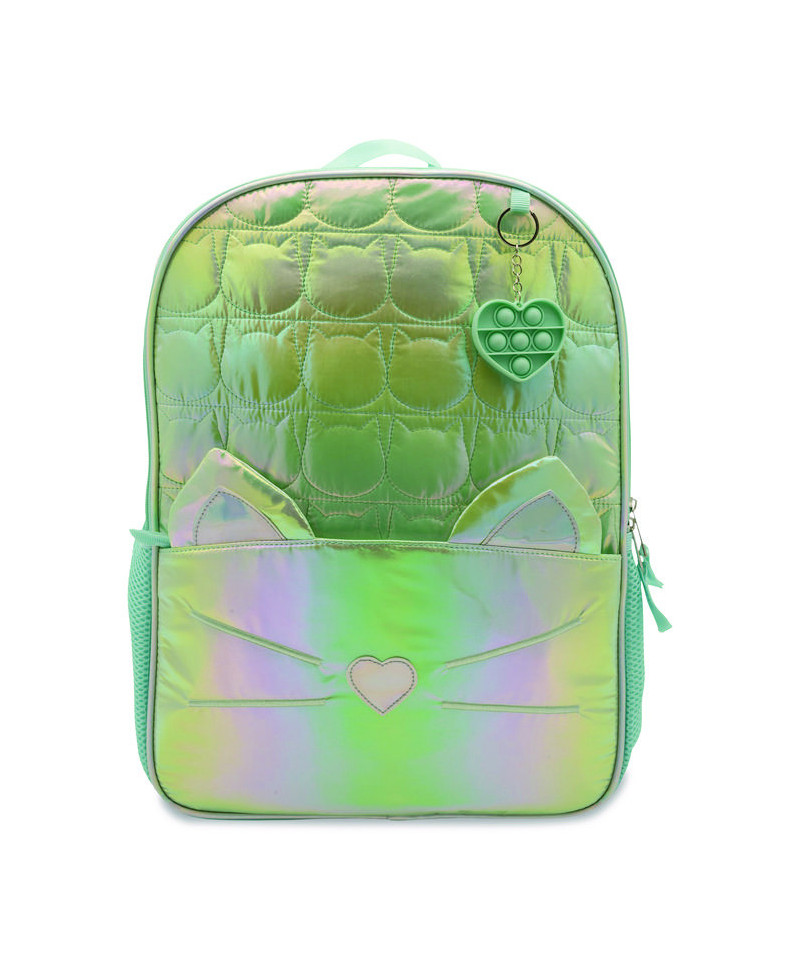 Great for back to school and beyond, the Iridescent Cat Backpack features a whimsical design with 3D poly-nylon cat ears, 3D PU nose and embroidered whiskers that cat lovers find adorable. And whether you have books or personal belongings, its quilted shell, padded back and padded adjustable shoulder straps make it a pleasure to carry. Two mesh side pockets and one front zip pocket keep important items and school supplies close. Includes a color-coordinated, pop-heart key chain.