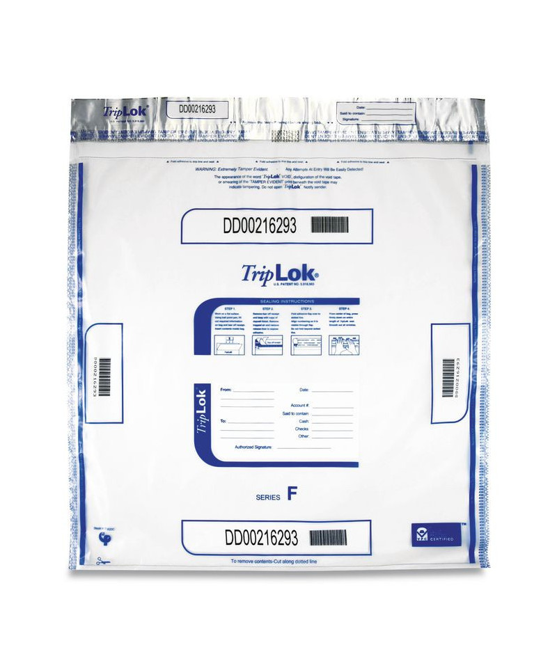 Helping you improve your vault and cash transport operations, the TripLOK™ Deposit Bag's patented triple-seal closure with interior adhesive leaves no openings once sealed; and to speed up your processing times, its anti-static liner prevents the bag from clinging to hands and clothes. Indented side welds prevent cutting and resealing, while micro perforations immediately reveal attempts to pull up the bag's closure up. Aqua-detect ink reveals exposure to fluids. Large-print serial numbers and barcodes make it easy to track the bag's progress through facilities via CCTV.