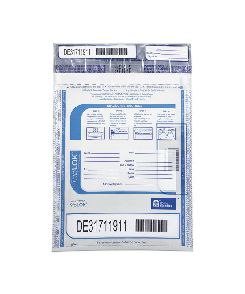 High visibility void message reveals tampering attempts. Patented triple-seal closure with interior adhesive leaves no openings once sealed. Special thermochromic ink turns red when subjected to heat. Security micro perforation immediately reveals attempts to pull closure up. Anti-static liner does not cling to hands and clothes, speeding up processing. Aqua detect ink reveals exposure to fluid. Large serial numbers and barcodes for easy tracking via CCTV. Indented side welds preventing cut and resealing. 1,000 note capacity.