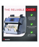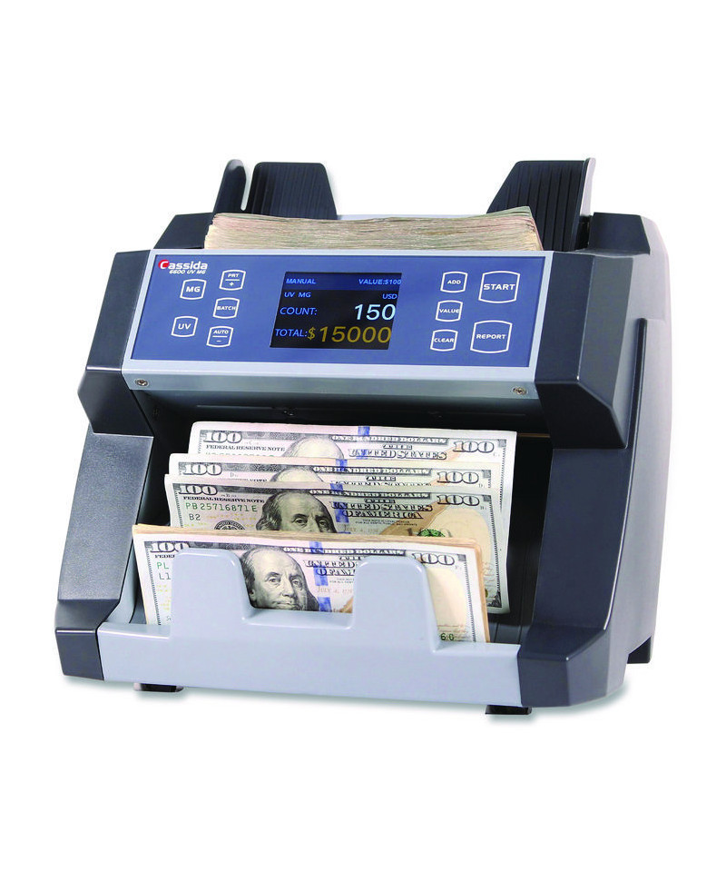 Use this feature-packed and high-speed Cassida 6600 currency counter machine to tackle various counting jobs. With commercial-grade capabilities, it is a high-speed bill counter that gives you reliable performance. This bill counter provides you with precise counting with speeds of up to 1,400 bills per minute. At this speed, it stops and alerts you to half, double and chained notes and expels the bills to help you keep an accurate count and eliminate errors. The cash handling machine's ultraviolet and magnetic sensors detect and alert you to counterfeit notes and dispenses the fake bills to its stacker for removal. Pressing the Start button resumes its count, automatically deducting the suspect bills from the tally. This note-counting machine comes with the standard add, count, batch and add plus batch options to help you in accounting and organizing the bills. It also features the Value Count function that computes the dollar value of various denominations. With an intelligent bill density recognition system, the cash handling equipment allows seamless stack counting by eliminating time-consuming stops. The machine has a built-in handle that simplifies transport. Use this heavy-duty money counter for businesses of all sizes. Cassida 6600 currency counter machine combines speed, accuracy and versatility.