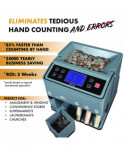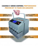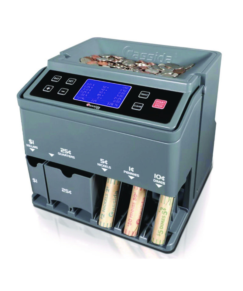 The user-friendly C300 Series Coin Sorter & Counter can streamline counting, sorting, adding, batching and wrapping tasks for US dollar, quarter, dime, nickel and penny coins. Fast, dependable and accurate, it features a 2,000-coin hopper and coin-counting/sorting speeds up to 300 coins per minute. Efficiency-enhancing QuickLoad™ coin tubes make swapping full rolls with the following coin wrapper easy, eliminating the need to remove each tube between rolls. Large LCD screen displays the coin denominations, total number of coins counted and their total value for added peace of mind. Pair it with Cassida's Thermal Printer (sold separately) to generate detailed daily count receipts, for easier banking and record keeping. Quiet, compact and portable, the C300 is wonderful addition to any small to medium sized business, from laundromats to casinos.