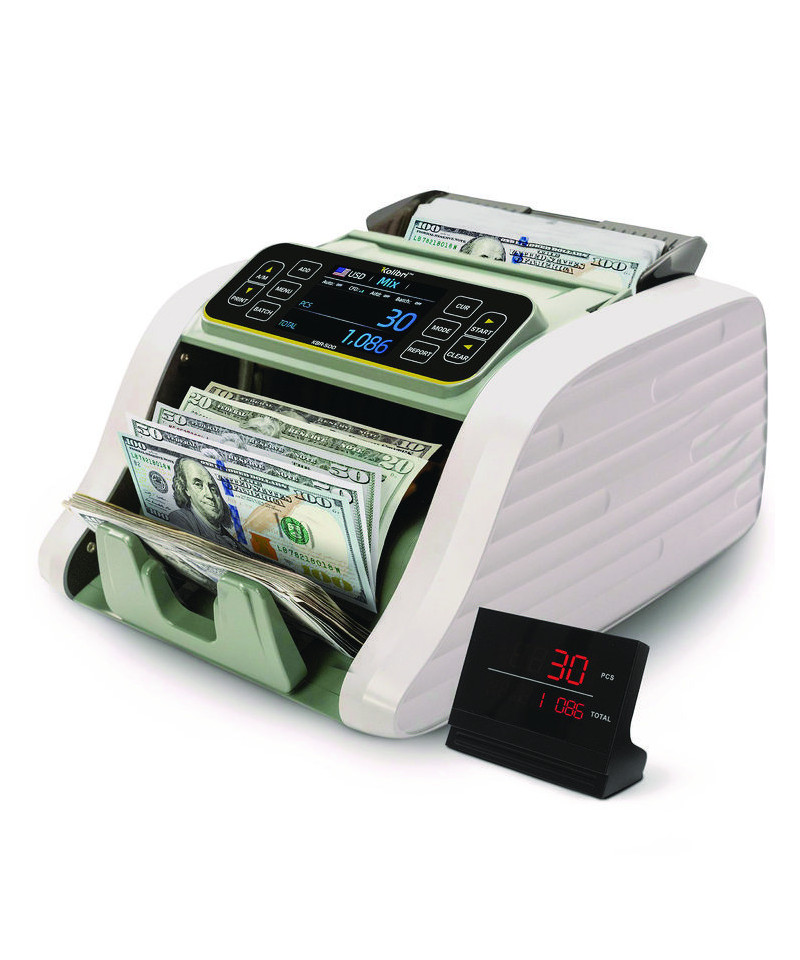 If you're looking for a reliable money counter with advanced counterfeit detection for your home or business, confidently choose the Kolibri KBR-500 Mixed Denomination Bill Counter. This back-loading machine helps you save time and reduce counting errors by swiftly and precisely counting and sorting stacks of currency at speeds up to 1,200 bills per minute. Never worry about the accuracy of a count again as this bill counter utilizes advanced ultraviolet, magnetic and infrared detection to stop operation for any suspected counterfeit bill as well as half, chain and double bill detection to ensure count accuracy. Large and clear TFT LCD display features an intuitive control panel with automatic modes and functions to make the Kolibri KBR-500 the perfect product for effortless cash handling. Business-grade, multi-currency design supports operation with currencies from the United States, Canada, Mexico, the United Kingdom and the European Union.