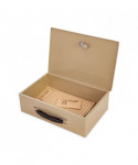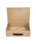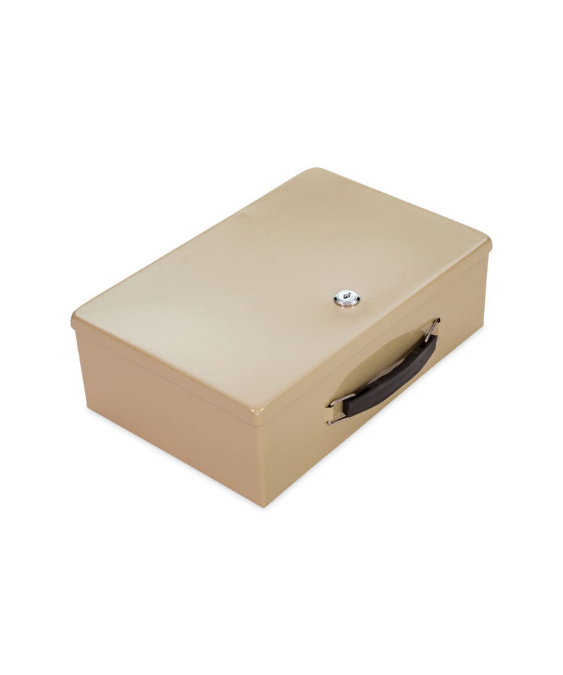 Heavy duty fire-retardant cash box is made of heavy metal that can withstand high temperature. It has a handle for portability and can be locked. Two keys are provided with the box. The box does not have a tray since it is meant for paperwork that you want to keep safe in a fire.