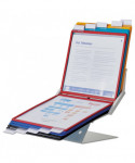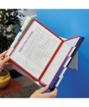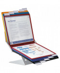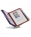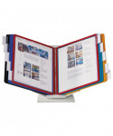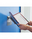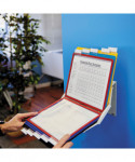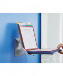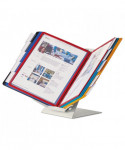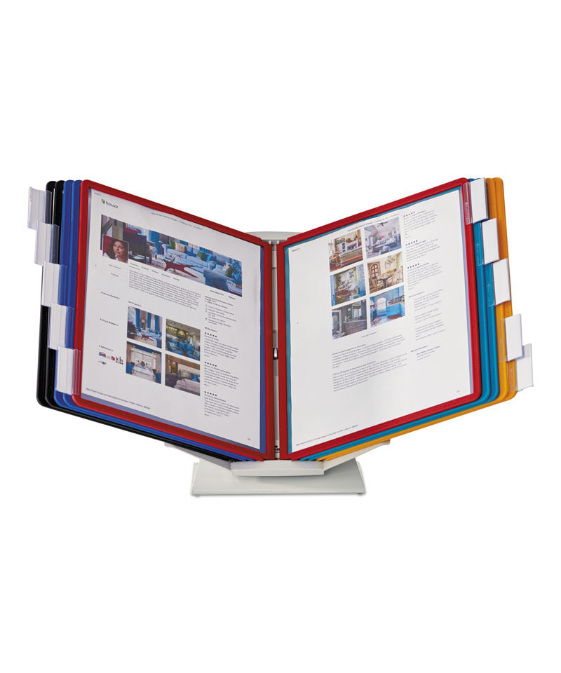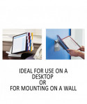 Organize and quickly access frequently used documents with the VARIO® Pro 10-Panel Desktop and Wall-Mount Reference System from DURABLE®. This German-designed organizational powerhouse is meticulously crafted for anyone seeking unparalleled efficiency. Made with German precision, this reference display system is a testament to quality, ensuring lasting durability. Say goodbye to flimsy alternatives and embrace the reliability of VARIO. Experience efficiency at your fingertips with easy-load, glare-free, and scratch-resistant pockets. Each high-quality sleeve is engineered to keep your paperwork crease and tear-free, even with frequent handling. The powder-coated steel base and non-slip grip also provide a stable foundation that stands up to heavy use. With 10 pockets capable of displaying up to 20 letter-size sheets, VARIO is the go-to solution for organizing schedules, SOPs, directories, class lists, instructions, charts, maps, emergency numbers, menus, team rosters – any frequently referenced paperwork. The perfect solution for high-traffic areas like lobbies, front desks, conference centers, warehouses and more, VARIO seamlessly integrates into your workspace. Whether positioned on your desktop at a 30° or 60° viewing angle or mounted on the wall (mounting kit included) depending on your needs, plus the patented rotating mechanism easily switches between portrait and landscape for optimal document orientation. Organize and color-code your documents with the assorted frame colors (2 black, 2 red, 2 yellow, 2 green, 2 dark blue) and 10 snap-on tabs. Also includes bracket, desk stand and optional wall-mounting kit. For over 100 years, DURABLE has been synonymous with quality, design, and functionality. As a testament to this legacy, DURABLE products combine innovative design with a wealth of experience. Trust in a brand that understands the importance of organization for enhancing productivity. Bring order to your daily routine and make referencing crucial information a breeze. Choose VARIO for an organized, streamlined, and optimized workspace. Choose DURABLE and experience the difference that quality and innovation can make.