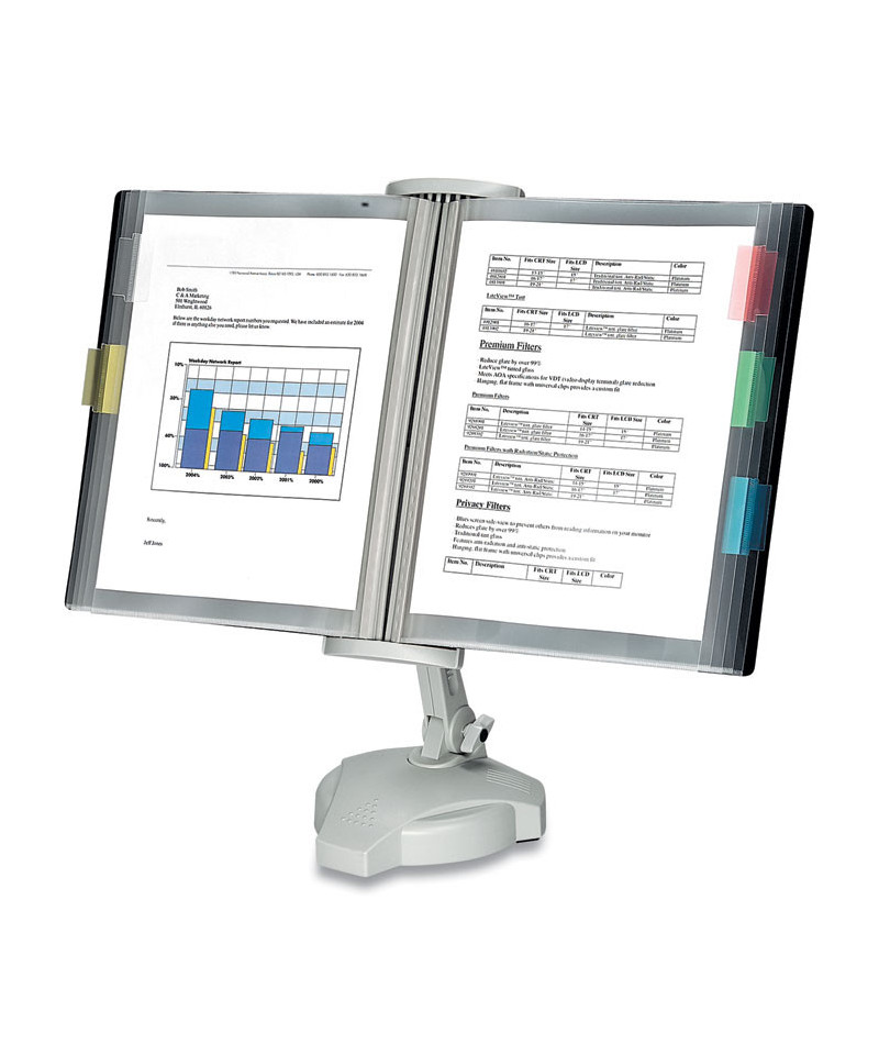 Fellowes Reference Rack keeps reference materials easily accessible. Rack features adjustable viewing height and angle. Ten clear plastic pockets hold up to 20 documents. Weighted base keeps reference rack stable while it is in use. Unit can be wall-mounted to save space (hardware not included). Includes index tabs. Keeps materials at eye level, making it easier to view your important papers. 21.13 x 7.13 x 18.63.
