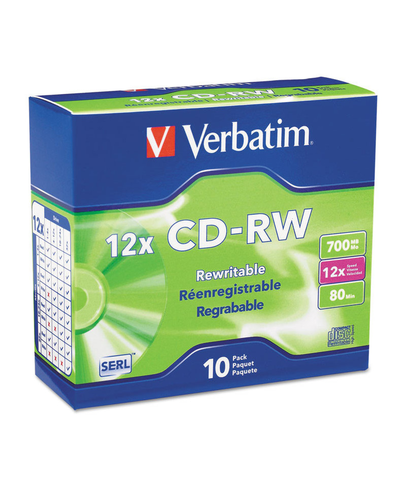 Verbatim CD-RW set the standard for performance compatibility and reliability. Each pack has a five-color assortment of CD-RW that adds simplicity to organize your data and important files with bright vibrant colors. These discs can be erased and rewritten to multiple times. Verbatim 4X-12X CD-RW media is ideal for drag and drop recording using packet writing software such as DirectCD. Look to Verbatim's CD-RW discs to store digital images data backup and desktop file storage