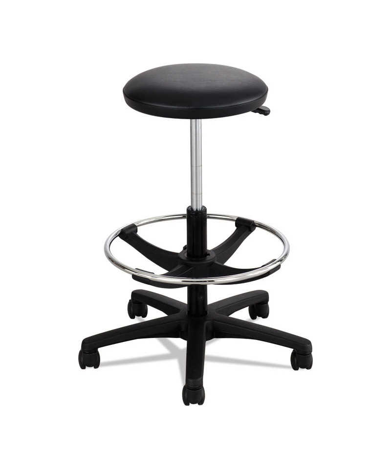 A user-friendly addition to any work environment. Features a comfortable ergonomic seat and foot ring height adjustment to perform a variety of tasks. Its adjustable-height, chrome foot ring may provide pressure point relief, muscle relaxation and improved circulation. The seat is padded and upholstered in highly resistant and easy to clean material. Featuring a 360-degree swivel and a five-star base outfitted with dual wheel casters, the stool allows you to move in either direction, and glide across carpet and hard flooring with ease.