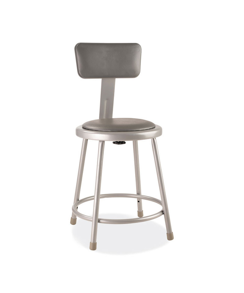 The fortified construction and soft comfort of the 6400 Series heavy-duty padded stools with backrests are ideal for hands-on educational settings like art rooms, science labs, home economics or shop classrooms. This reliable stool features a sturdy frame of 18-gauge steel tubing securely welded to a 14" diameter seat pan. Riveted through the steel pan are 0.5" thick vinyl cushioning that will provide years of dependable use. Footrest ring is securely bonded to each leg with four spotweld contact points. The padded adjustable backrests can be moved two inches up/down and forward/back.