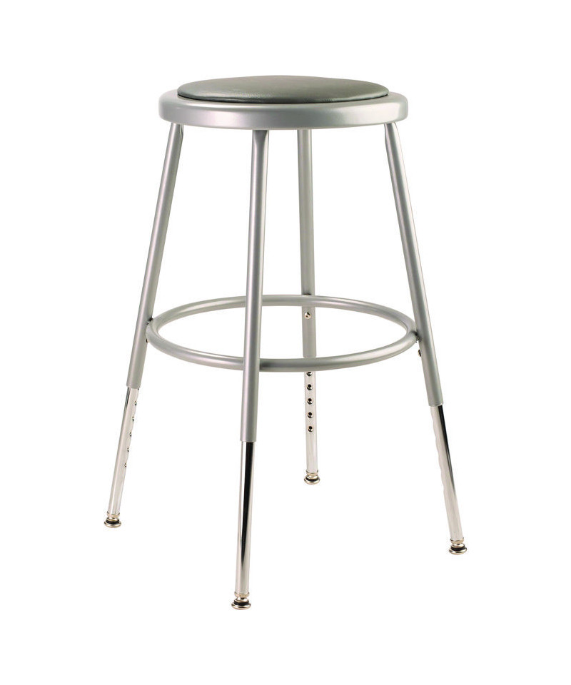 The fortified construction and soft comfort of the 6400 Series heavy-duty padded stools are ideal for hands-on educational settings like art rooms, science labs, home economics or shop classrooms. Height-adjustable legs extend in 1-inch increments. This reliable stool features a sturdy frame of 18-gauge steel tubing securely welded to a 14" diameter seat pan. Riveted through the steel pan are 0.5" thick gray vinyl cushioning that will provide years of dependable use. Footrest ring is securely bonded to each leg with four spotwell contact points.