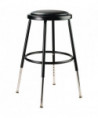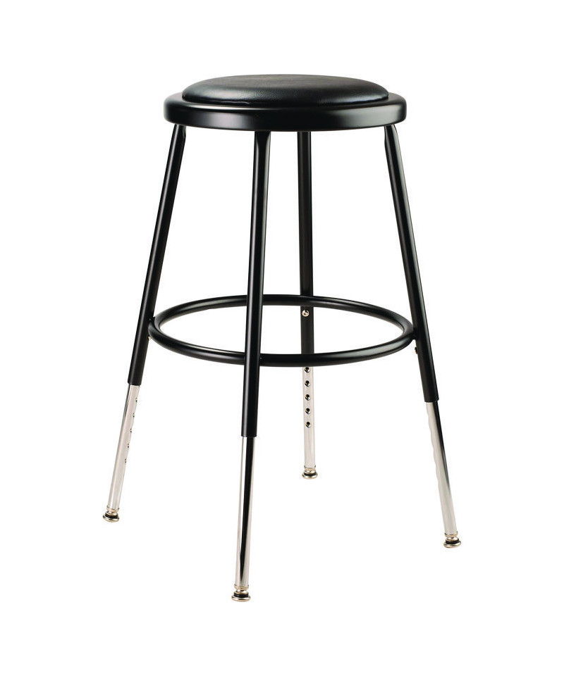 The fortified construction and soft comfort of the 6400 Series heavy-duty padded stools are ideal for hands-on educational settings like art rooms, science labs, home economics or shop classrooms. Height-adjustable legs extend in 1-inch increments. This reliable stool features a sturdy frame of 18-gauge steel tubing securely welded to a 14" diameter seat pan. Riveted through the steel pan are 0.5" thick gray vinyl cushioning that will provide years of dependable use. Footrest ring is securely bonded to each leg with four spotwell contact points.