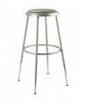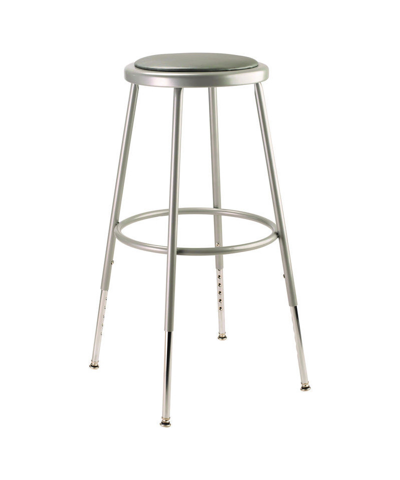The fortified construction and soft comfort of the 6400 Series heavy-duty padded stools are ideal for hands-on educational settings like art rooms, science labs, home economics or shop classrooms. Height-adjustable legs extend in 1-inch increments. This reliable stool features a sturdy frame of 18-gauge steel tubing securely welded to a 14" diameter seat pan. Riveted through the steel pan are 0.5" thick gray vinyl cushioning that will provide years of dependable use. Footrest ring is securely bonded to each leg with four spotwell contact points.