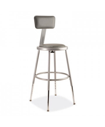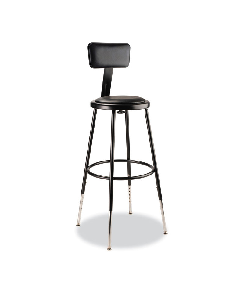 The fortified construction and soft comfort of the 6400 Series heavy-duty padded stools with backrests are ideal for hands-on educational settings like art rooms, science labs, home economics or shop classrooms. These reliable stools feature a sturdy frame of 18-gauge steel tubing securely welded to a 14 inch diameter seat pan. Riveted through the steel pan are 0.5 inch thick vinyl cushioning that will provide years of dependable use. Footrest ring is securely bonded to each leg with four spotweld contact points. Height-adjustable legs extend from 25 inches to 33 inches in 1-inch increments and adjustable padded backrests can be moved two inches up/down and forward/back.