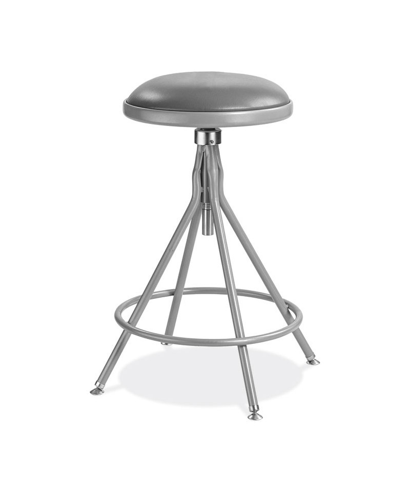 Institutions interested in ultimate strength, comfort and access for their hands-on educational environments need look no further than the NPS 6500 Series heavy-duty padded swivel stools. These reliable stools feature a sturdy frame of 18-gauge steel tubing securely welded to a 14" diameter seat pan. Riveted through the steel pan are 1.5" thick vinyl cushioning that will provide years of dependable use. Swivel seat spins with ease 360 degrees enabling users to maximize their workspace. Footrest ring is securely bonded to each leg with four spotwell contact points for extra fortification. Height-adjustable seat. Rotating metal floor glides keep the stool level and prevent any floor damage.