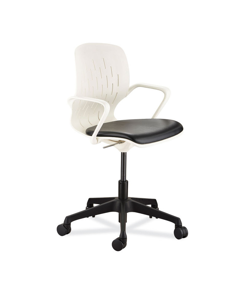 The minimalistic, easy-to-use Shell™ Desk Chair provides intuitive adjustments and a sleek design that suits any workspace. Featuring a contoured back for lumbar support and a frame that naturally flexes to fit the individual user, this task chair is great for long work days. For additional comfort, there is a cushioned, upholstered seat with arms. Holes in the chair's back provide comfortable breathability. Upholstery is vinyl, making it easy-to-clean. The seat height is easily adjustable to suit a wide range of user heights. A sturdy, five-star base with casters and 360-degree swivel capabilities ensures the user can move and reach anything they need throughout the day. Great for use in personal workspaces, conference rooms, computer labs, home offices or a variety of other areas to provide an easily adjustable and stylish seating option.