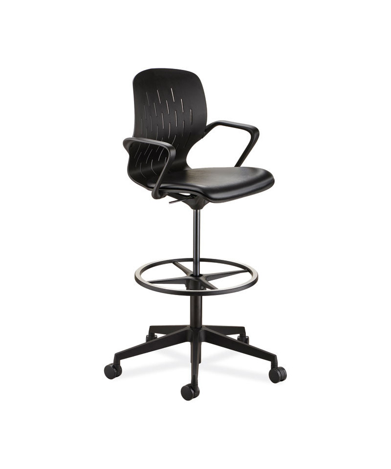 The easy-to-use Shell™ Extended-Height Chair provides intuitive adjustments and a sleek design that suits any workspace. Featuring a contoured back for lumbar support and a frame that naturally flexes to fit the individual user, this drafting chair is great for long work days. For additional comfort, the seat and arms are available with upholstered padding. The seat's back includes stylish holes that provide comfortable breathability during use. Upholstery is vinyl, making it easy-to-clean. The seat height of this chair is easily adjustable from 22" to 32" to suit a wide range of user heights. This height pairs perfectly with standing or adjustable-height desks to help encourage a more active, yet comfortable, workday. The flat footring around the base provides an ergonomic support while sitting, and is adjustable to suit the needs of the user. A sturdy, five-star base with casters and 360-degree swivel capabilities ensures the user can move and reach anything they need throughout the day. Great for use in personal workspaces, computer labs, home offices, design studios, architecture firms, warehouses, conference rooms or anywhere else an extended-height chair is needed.