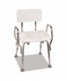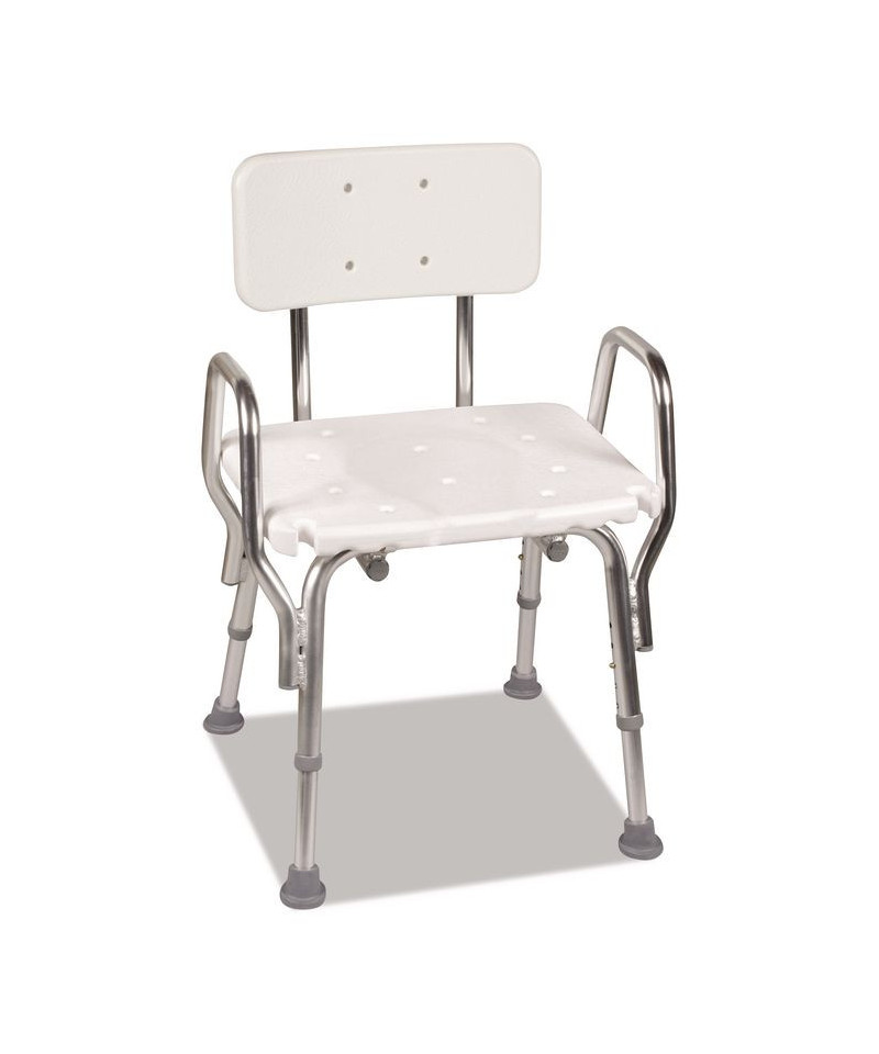 Blow-molded plastic seat with textured, non-slip surface. Arms provide additional support and safety. Lightweight, aluminum frame. Slip-resistant, suction cup tips. Seat height adjusts from 16" to 20" in 1" increments. Tool-free assembly. Contains latex.
