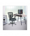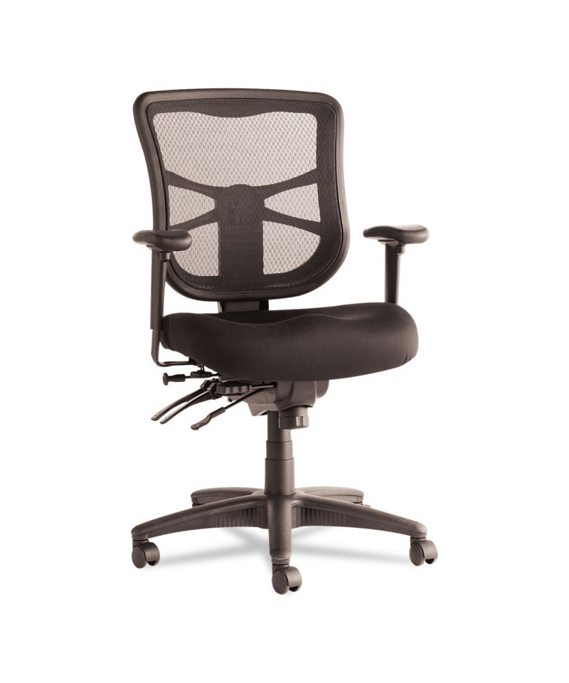 Multifunction mechanism with seat glide allows back angle adjustment relative to seat, adjustable tilt (free floating or infinite locking positions) and forward tilt. Cool, breathable mesh back. Contoured seat cushion with waterfall edge to help relieve pressure on legs. Height- and width-adjustable arms with soft polyurethane pads. Five-star base with casters for easy mobility.