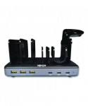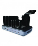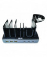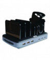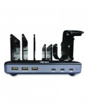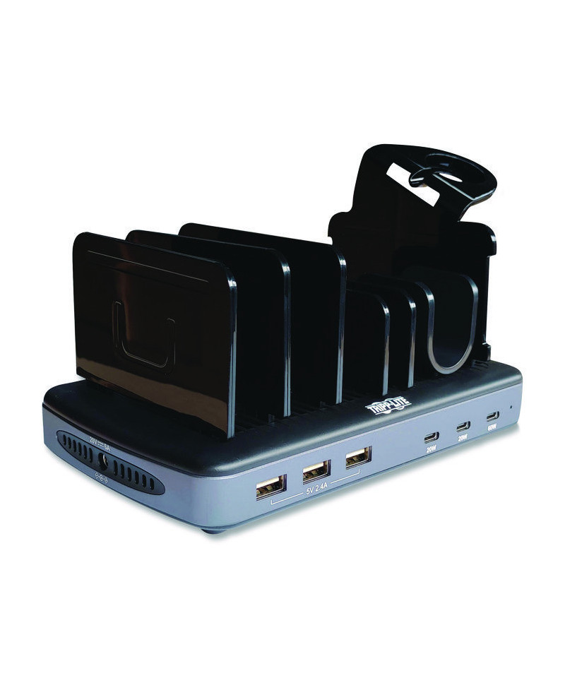 At home or in the office, this USB charging station provides enough power and ports to keep your devices at high capacity. No more peering behind furniture to find an available outlet or unplugging one device to charge another. This compact charging station is ideal for homes with busy families, dorm rooms and offices with multiple devices. It charges up to six devices at the same time, including PD Charging-enabled laptops, smartphones, tablets, Chromebooks, e-readers, earbuds and smartwatches and handheld gaming consoles. It doesn't require a computer, so you can take it anywhere AC power is available. Five tall and three short brackets are included to hold multiple devices during charging or to store them and keep them organized when not in use. Also included are special brackets for Bluetooth headphones and an Apple Watch. The brackets easily insert into slots built into the charger's surface. You can customize storage space according to the number and size of the connected devices, ranging from smartphones and AirPods to larger laptops and tablets. Three USB-A ports provide a maximum of 5 V 2.4 A (12 W) of power, enough for fast-charging most smartphones, Bluetooth earbuds and Apple Watches. For devices that are more powerful, one USB-C port provides up to 60 W PD charging for battery-intensive devices like the MacBook Pro or Chromebook Pixel. Two more USB-C ports support PD charging up to 20 W for tablets and handheld gaming consoles. To charge your USB devices, simply plug the included 120 W power supply into any standard NEMA 5-15R outlet and connect your devices to the available USB ports. The charger protects against overheating, overcurrent and overcharging. A green LED indicates the unit is on and receiving AC power.