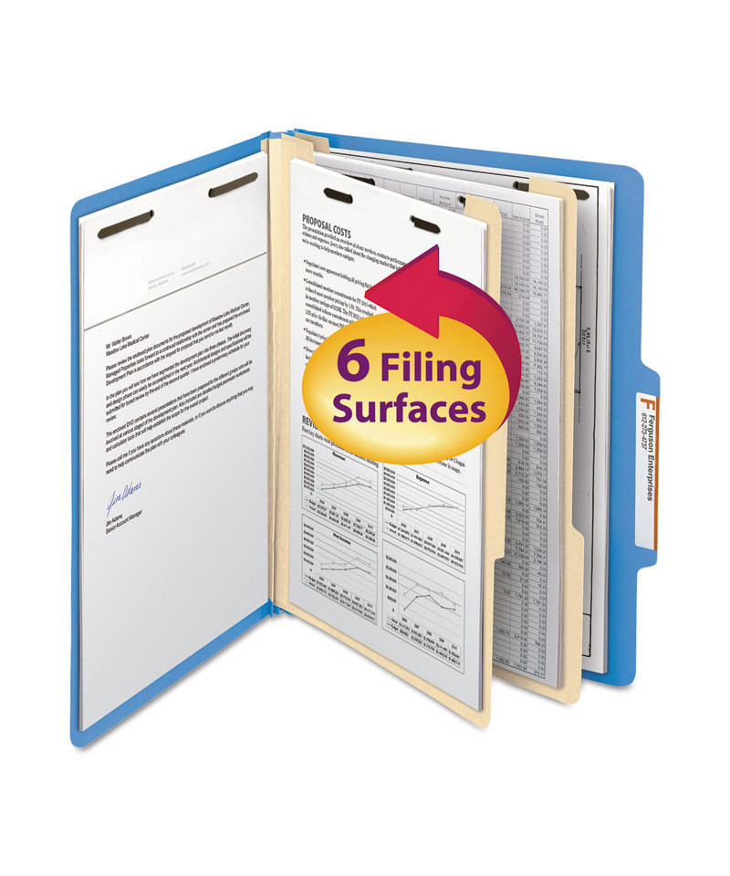 Heavyweight project files allow you to create subdivisions of material within one folder. Fasteners on front and back panels and dividers create four to six separate filing surfaces. Use color to categorize file types. Protect your documents and fingers with Smead patented SafeSHIELD® Coated Fastener Technology; the ultimate solution to fastener issues, including paper tears, finger cuts and excessive fastener crinkling.