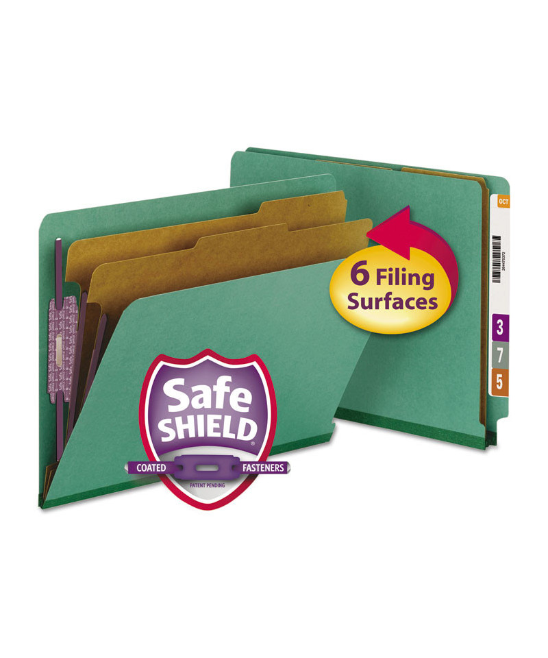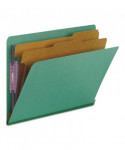 End Tab Pressboard Classification Folders, Expands 2", 2 Dividers, 6 SafeSHIELD Fasteners, Letter Size, Green, 10/Box