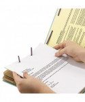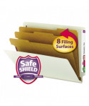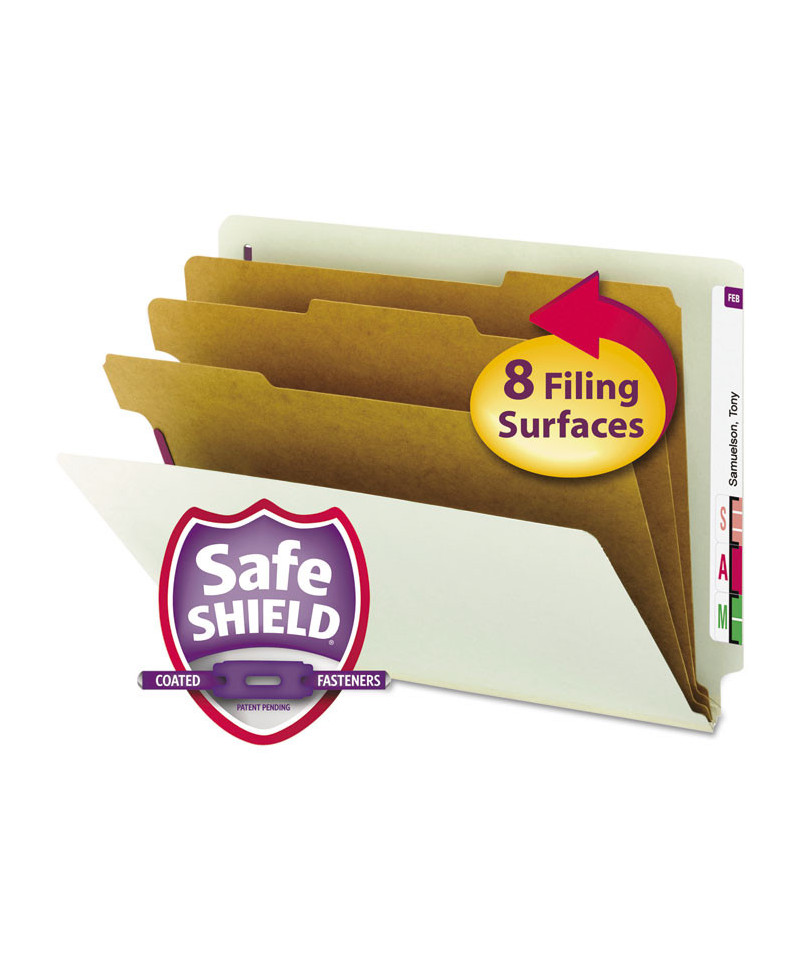 The ultimate classification folder when safety and security are most important. SafeSHIELD® bonded fasteners add protection for papers and fingers, while also reducing fastener crinkling. Dividers with tabs and fasteners on both sides let you store information under several subdivisions, and fasteners on the front and back panels add two more filing surfaces. Made of heavyweight pressboard material for extra durability. Use different colors for different types of projects. Labels sold separately.
