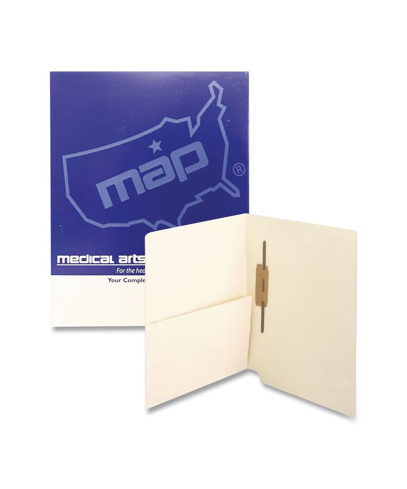Keep reports, test results, notations and other important materials together within broader files when you choose Medical Arts Press® Slash Pocket End Tab Fastener Folders. Handy slash pocket accommodates unwieldy materials such as photos, x-rays and similar items while the embedded fasteners allow you to further subdivide your files. Extended end tabs simplify labeling, browsing and retrieval, making them a smart solution for shelf filing systems.