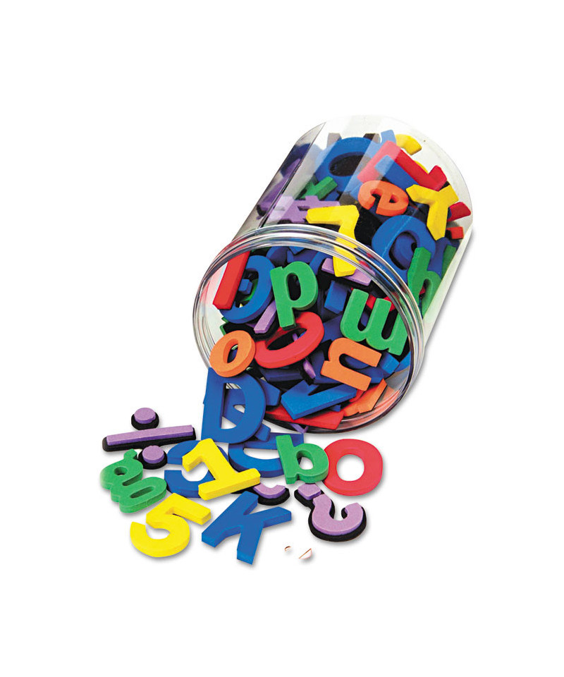 Durable, washable foam letters and numbers have a magnetic backing. Set includes capital and lower case letters, numbers and a variety of punctuation marks and math symbols which are color-coded to help early learning. Capital letters and numbers are 1.5" high and lower case letters are 1". Includes a re-sealable soft plastic jar with handle.