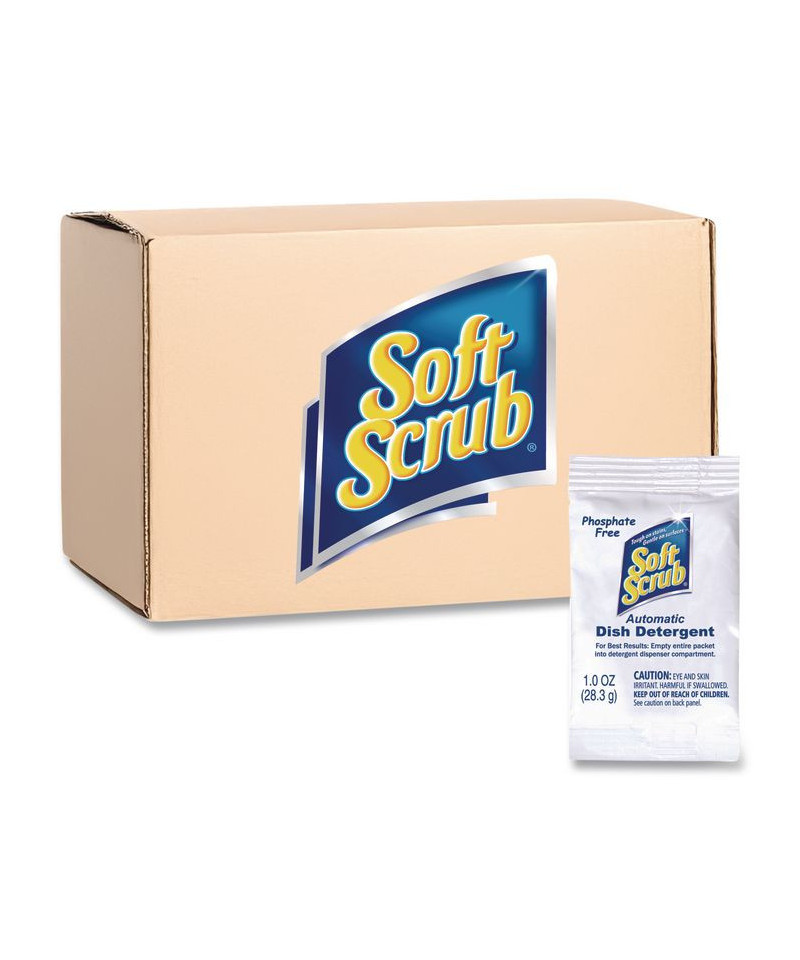 Soft Scrub® Automatic Dish Detergent is formulated to be tough on stains and gentle on surfaces. This phosphate free formula with lemon scent is prepackaged for one single use to remove food and residue from dishes leaving them with a clean, polished look. Conveniently prepackaged powder dish detergent for automatic dishwashers. For best results, empty entire packet into automatic dish detergent dispenser compartment. Package includes 200 1 oz packets per case.