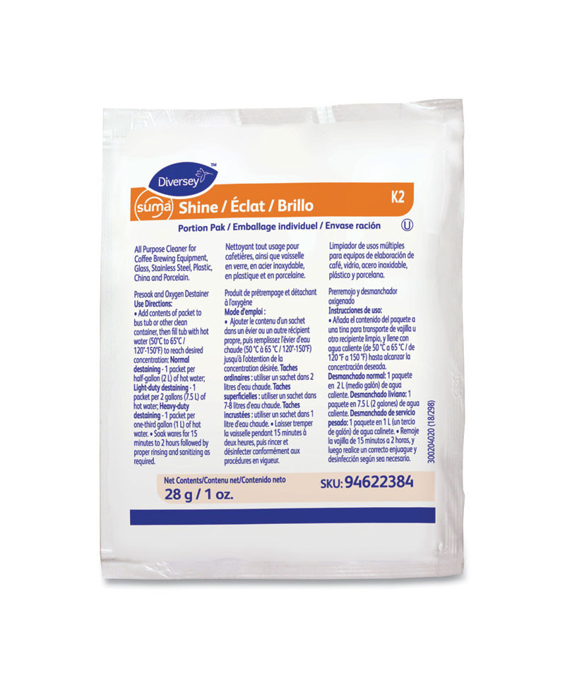 An oxygen-based, powdered presoak and destainer for plastic cups, plates, flatware, utensils, glass coffee pots, coffee urns and tea urns. White powder with no fragrance added.