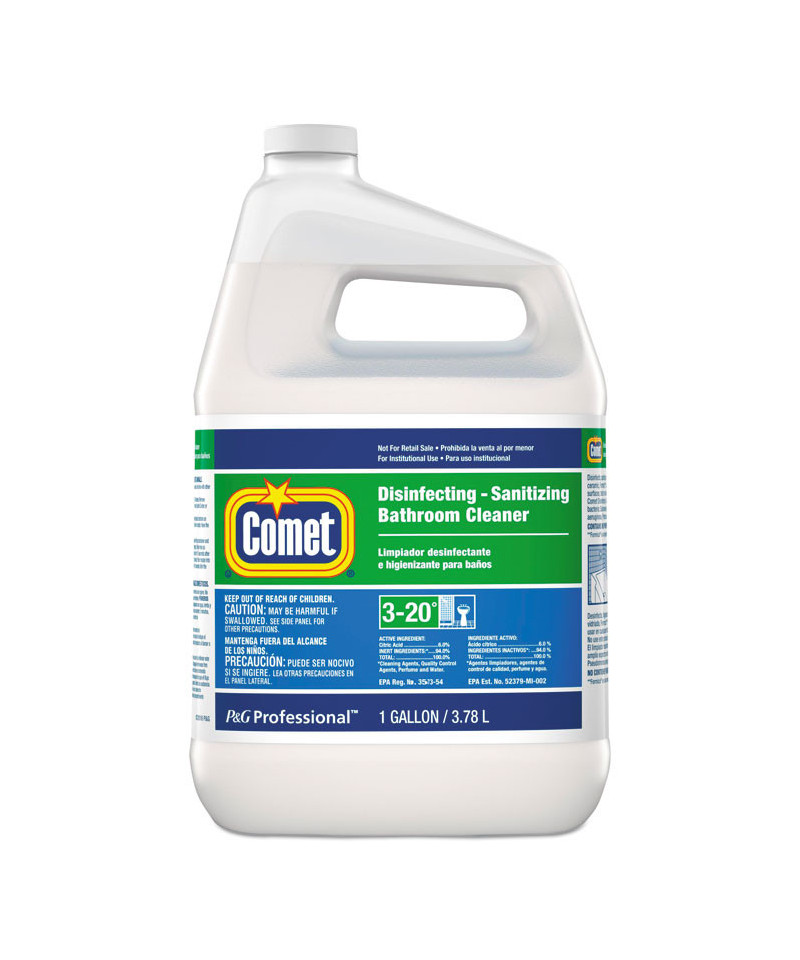 Comet Disinfecting-Sanitizing Bathroom Cleaner is a powerful bathroom disinfectant cleaner that cuts through tough soap scum, leaving surfaces clean and disinfected (when used per disinfecting label instructions). Its patented no scrub bathroom cleaner formula uniquely penetrates tough bathroom soils with little effort. It's nonabrasive, so it safely cleans porcelain, fiberglass, ceramic, Formica, enamel, chrome, stainless steel and synthetic marble. With no rinsing required, just spray it on and wipe the restroom clean. This disinfecting bathroom cleaner deodorizes, leaving the restroom smelling clean and fresh.