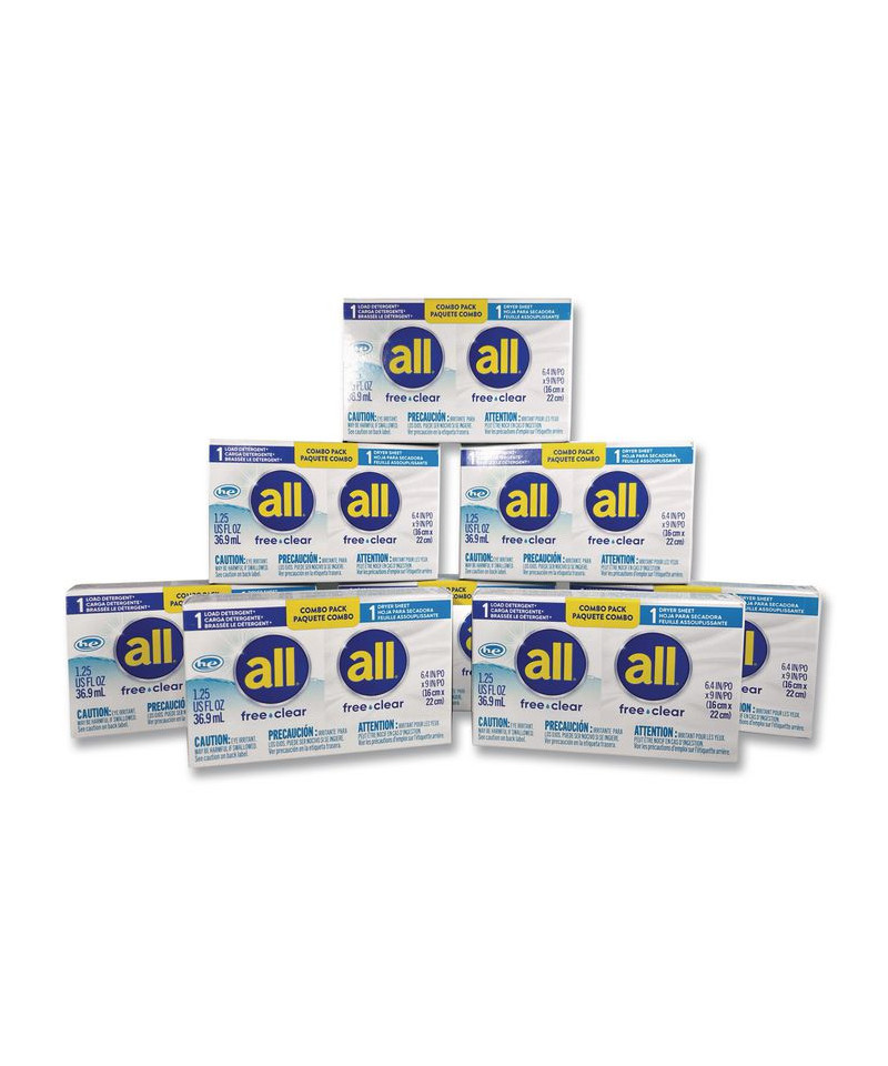 Convenient dual pack contains everything you need for perfectly clean clothes, with a single-serve pack of detergent and a dryer sheet. Dermatologist recommended detergent is free of perfumes and clear of dyes, making it a great choice for consumers with sensitive skin. Hardworking stainlifters get your clothes thoroughly clean. Helps remove three of the top everyday allergens: dust mite matter, cat and dog dander. Detergent is designed to work with high efficiency machines and is effective in all water temperatures. Hypoallergenic. Dryer sheets are specially formulated for sensitive skin.