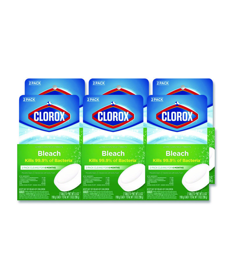 Clorox® Ultra Clean Toilet Tablets kill 99.9% of bacteria and deodorizes your toilet with the power of Clorox® bleach. This toilet bowl cleaning tablet, effectively cleans and prevents stains with each flush, eliminating the need to scrub every time. Each tablet delivers a long-lasting bleach clean and is good for up to three months. Simply drop a tablet into your toilet tank to continuously sanitize, deodorize and clean your toilet every time you flush. The dissolvable cleaning tablets help prevent tough stains and removes hard water, mineral deposits and limescale stains. Ideal for use in restaurants, cafeterias, offices, hotels, daycares and other commercial facilities. Keep your toilet bowl sparkling fresh and ultra clean with no mess and no fuss with the help of Clorox® Ultra Clean Toilet Tablets.