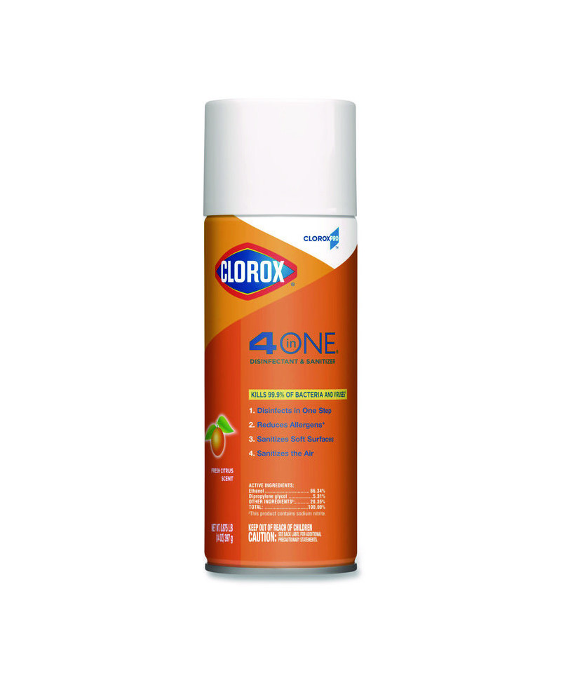 To help keep living and working environments healthy, it's important to clean and disinfect multiple surfaces, a process that once required multiple products. Clorox® 4 in One Disinfectant & Sanitizer lets you disinfect, sanitize and reduce allergens with a single all-purpose aerosol spray. This powerful cleaner disinfects hard surfaces with 24 EPA-registered kill claims, and sanitizes soft surfaces in as little as 30 seconds. It meets EPA criteria for use against SARS-CoV-2, the virus that causes COVID-19, on hard nonporous surfaces when used as directed. This disinfecting spray even kills odor-causing bacteria in the air, and leaves behind a refreshing scent. On top of that, Clorox® 4 in One reduces pet dander, dust mite matter and cockroach matter allergens which can trigger allergies and asthma. Ideal for offices, day care centers, schools, hotels, restaurants and other commercial facilities. No precleaning required. CloroxPro®, where clean means everything.