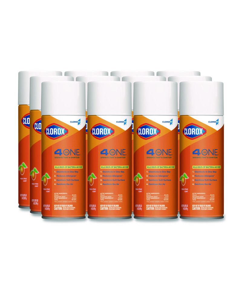 To help keep living and working environments healthy, it's important to clean and disinfect multiple surfaces, a process that once required multiple products. Clorox® 4 in One Disinfectant & Sanitizer lets you disinfect, sanitize and reduce allergens with a single all-purpose aerosol spray. This powerful cleaner disinfects hard surfaces with 24 EPA-registered kill claims, and sanitizes soft surfaces in as little as 30 seconds. It meets EPA criteria for use against SARS-CoV-2, the virus that causes COVID-19, on hard nonporous surfaces when used as directed. This disinfecting spray even kills odor-causing bacteria in the air, and leaves behind a refreshing scent. On top of that, Clorox® 4 in One reduces pet dander, dust mite matter and cockroach matter allergens which can trigger allergies and asthma. Ideal for offices, day care centers, schools, hotels, restaurants and other commercial facilities. No precleaning required. CloroxPro®, where clean means everything.