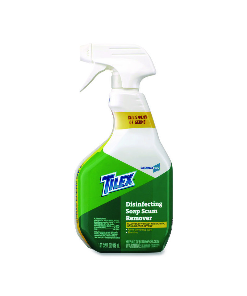 The powerful formula of Tilex® CloroxPro® Disinfecting Soap Scum Remover Spray cleans soap scum before your eyes. Its penetrating foam removes soap scum and hard water deposits on surfaces to help prevent buildup from calcium, lime and rust. It also kills 99.9% of germs including Staphylococcus aureus, Salmonella enterica and the COVID-19 virus on hard nonporous surfaces when used as directed. Great on many surfaces including glazed ceramic tile, fiberglass, shower doors, toilets and sinks, this spray cleaner is ideal for offices, day care centers, restaurants, hotels and other commercial facilities. CloroxPro® where clean means everything. Packaging may vary.