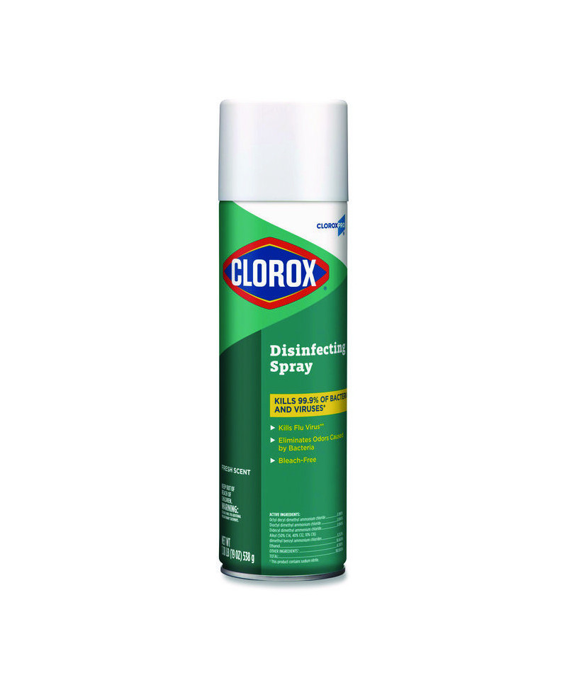 Fight germs and odor in your facility with Clorox® Disinfecting Spray that kills 99.9% of bacteria and viruses on hard nonporous surfaces. Tested according to the AOAC Germicidal Spray Product Test for disinfectants, this trusted product eliminates odors caused by bacteria and kills flu virus. It is EPA registered to kill as many as 64 microorganisms, and it kills most bacteria on its EPA Master Label in three minutes. With incredible versatility, Clorox® Disinfecting Spray can be used on a wide variety of hard surfaces like garbage cans, diaper pails, changing tables, gym equipment, tables, toilet seats, faucets, sinks, countertops, doorknobs, telephones and more. From CloroxPro®, this disinfecting spray is ideal for use in schools, dorms, day care centers, offices, kitchens, restaurants, hospitals, hotels, health clubs, public areas and more.