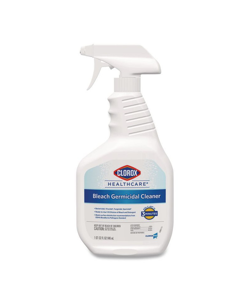 Your proven bleach solution for cleaning. Clorox Healthcare® Bleach Germicidal Cleaner kills C. difficile and C. auris in three minutes and over 50 other microorganisms in one minute or less, including outbreak causing viruses, emerging viral pathogens, MRSA and VRE when used as directed. Compatible with common healthcare surfaces including plastics and stainless steel, this versatile hospital cleaner is even recommended in medical equipment cleaning and care guides. Use in healthcare settings including hospitals, medical facilities, outpatient facilities and long-term care facilities. Follow special instructions for cleaning prior to disinfection. A precleaning step is required to kill Clostridioides difficile and Candida auris.