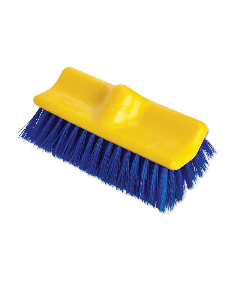 Split-brush shape has straight and angled bristles. For wet scrubbing in open areas and under equipment. Long-lasting polypropylene fibers resist stains. Accepts threaded handles. Handles sold separately.