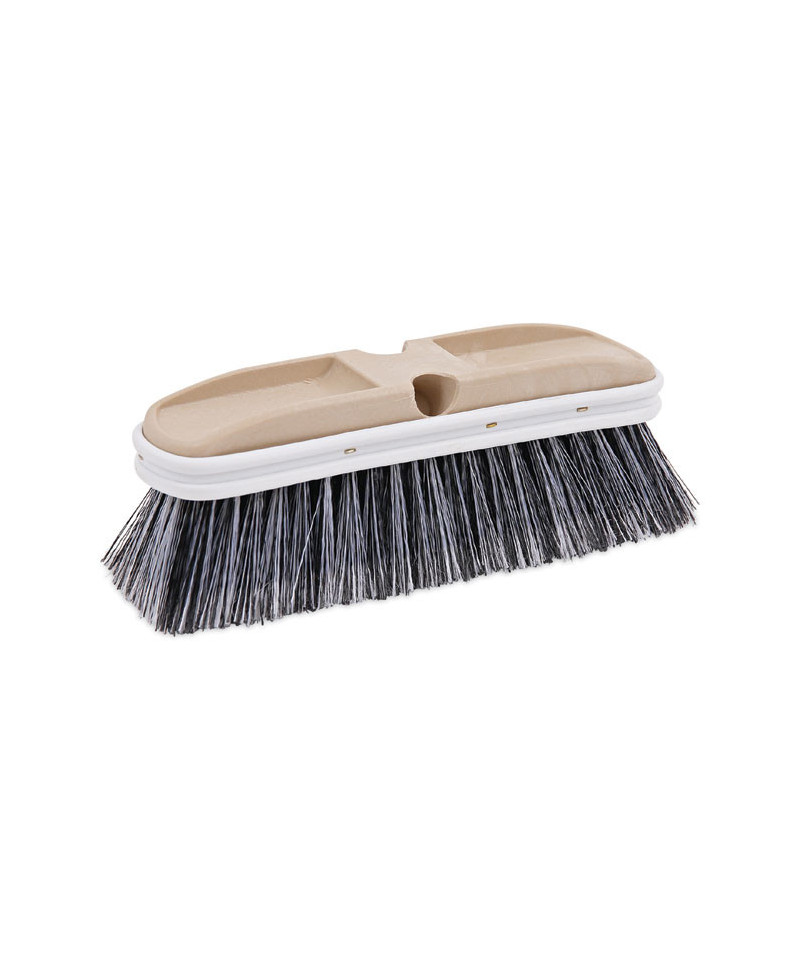 Use this brush to thoroughly clean your vehicles with care. It is constructed of a 2.5" wide flow-through, plastic block with two holes for multiple handle compatibility. It is compatible with 1 1/8" diameter tapered or threaded end handles (sold separately). The vinyl bumper protects vehicle finish from dents and scratches. Self-flagged polystyrene bristles provide soft yet effective scrubbing.